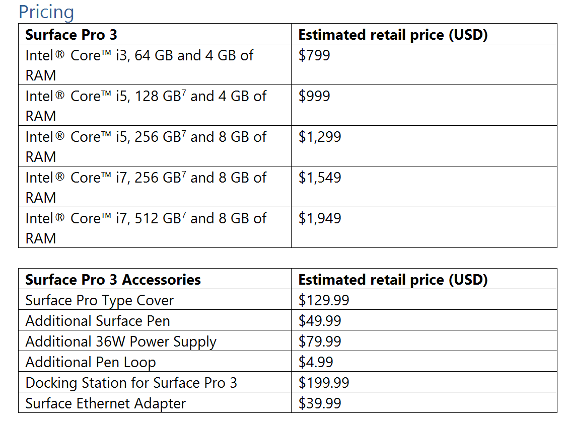 Mary Jo went on to tweet a price list. Note that the stylus is included with the Surface Pro 3. They keyboard is not included. This is the same as before. Note that the last minute leaks had the correct pricing. Those stories also talked of a limited edition Surface Pro 3, and the possibility of getting it in 3 non-black colours.
